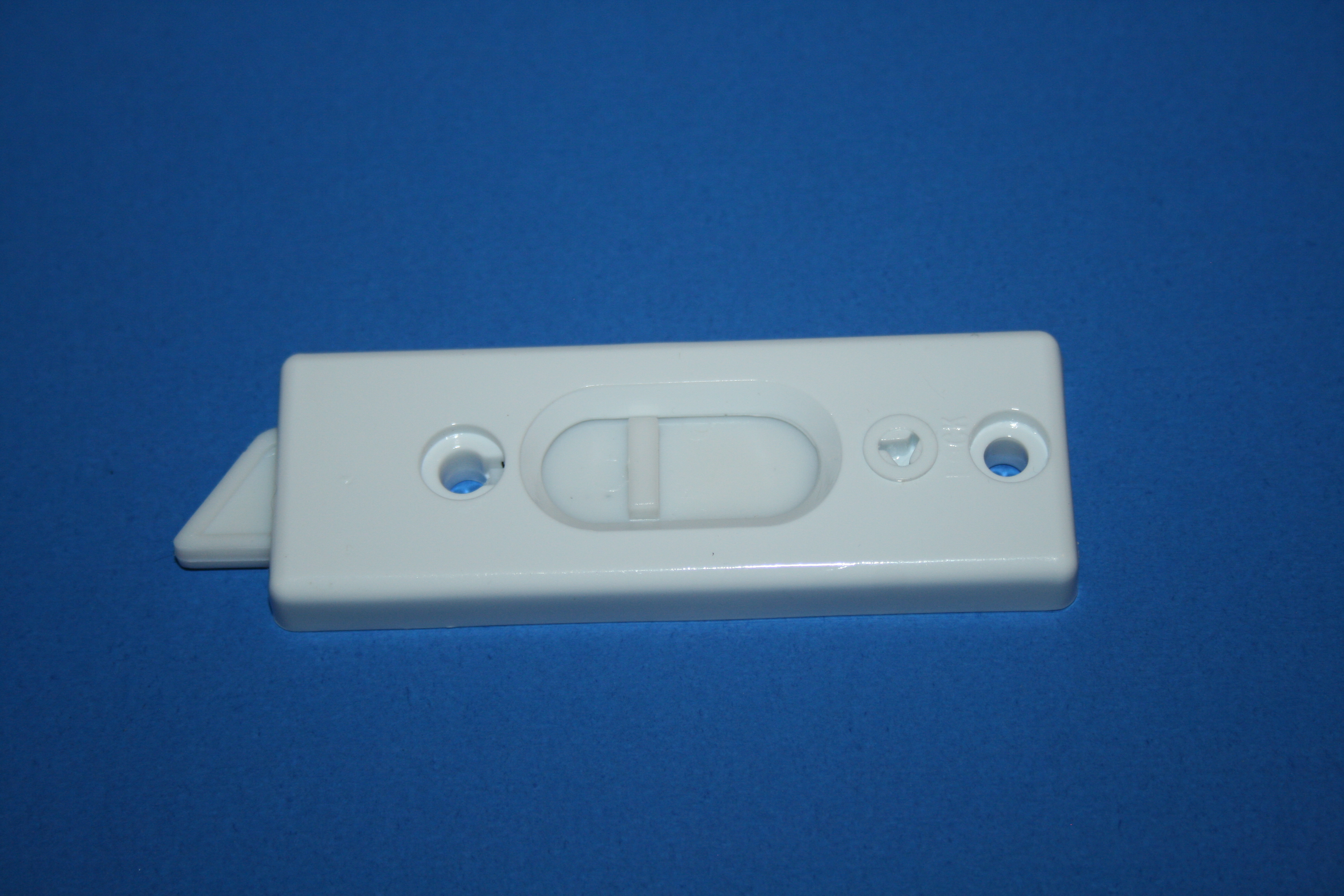 Left handed white tilt latch measure 3 3/8″ long x 1 1/4″ wide center mounting hole to center mounting hole measures 2 5/16″
