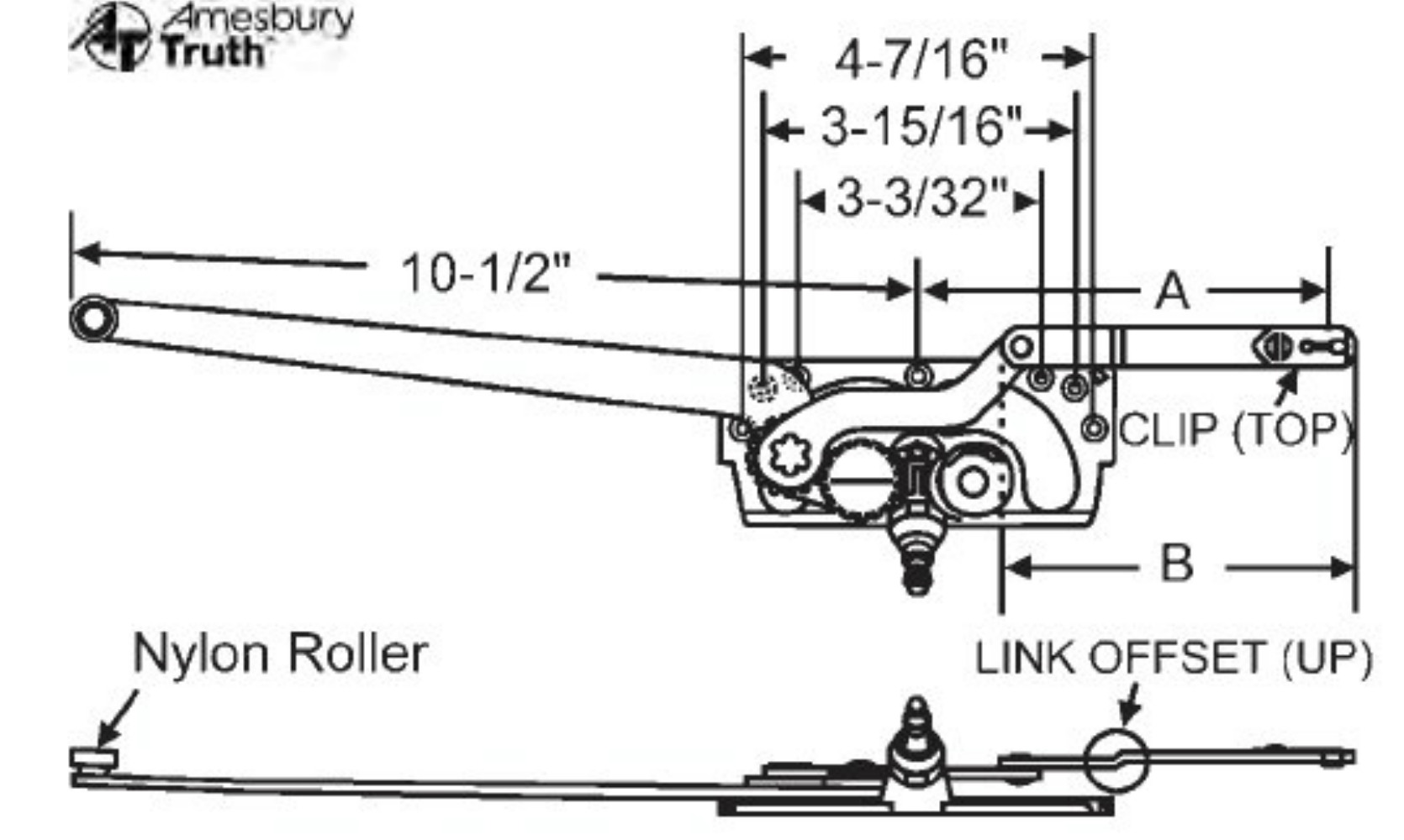 Truths Entrygad Dual arm operator number on the arm reads 40754 center mounting hole center of mounting plate to the end of straight arm measures 10 1/2″ small arm end with clip measures 4 7/16″ from center hole in mounting plate to end of arm common replacement crank numbers are 20810, 20544, 40372, 40471, 40254, 40753, 30470, 30472, 40754, L30841, 31358A, 31358, 30637, 30842 these are common but not always please verify the dimensions on yours before ordering.